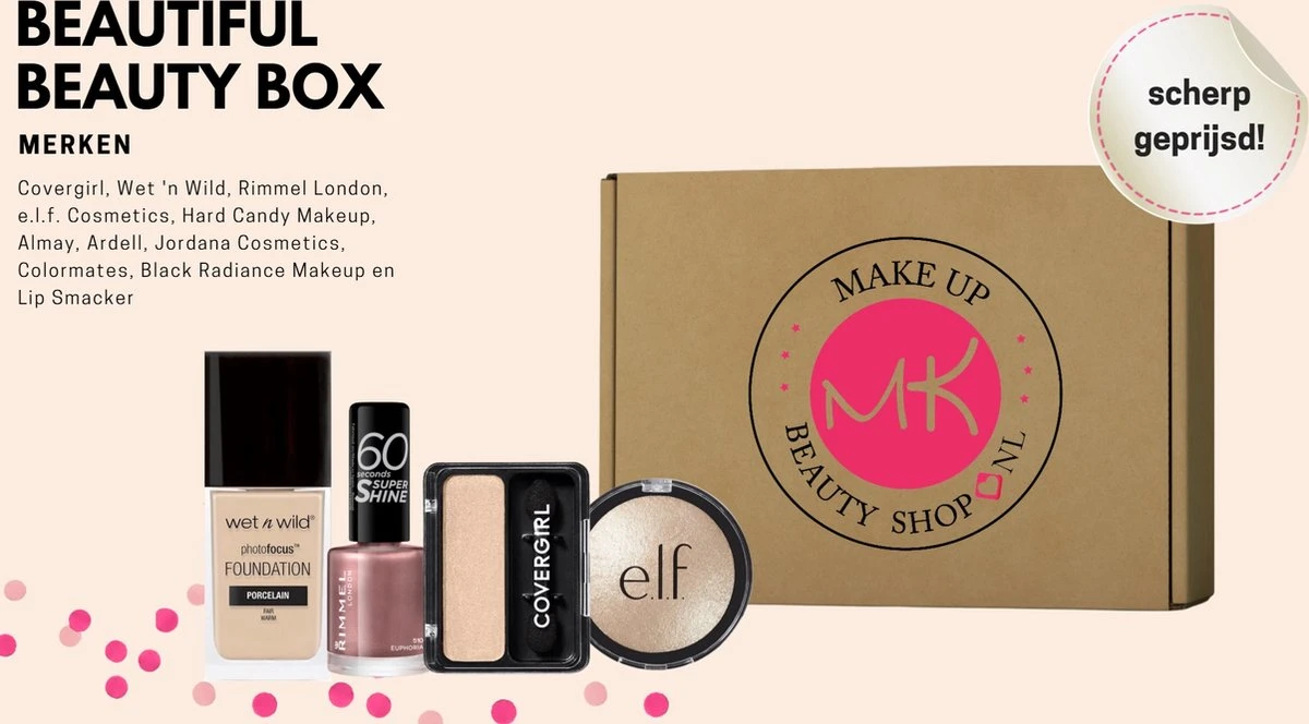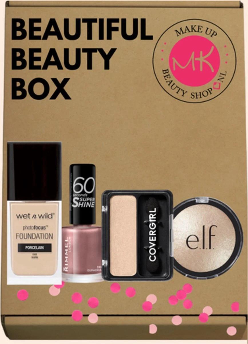 Deze Beautiful Mystery Beauty Box heeft onder andere items van de hippe make-up merken: Covergirl, Wet ’n Wild, Rimmel London, e.l.f. Cosmetics, Hard Candy Makeup, Almay, Ardell, Jordana Cosmetics, Colormates, Black Radiance Makeup en Lip Smacker.