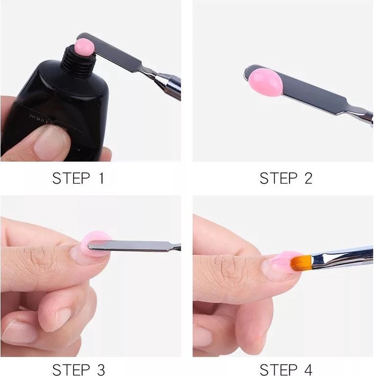 Met het spateltje breng je de poly gel eenvoudig aan en met het gel penseel breng je het in model.