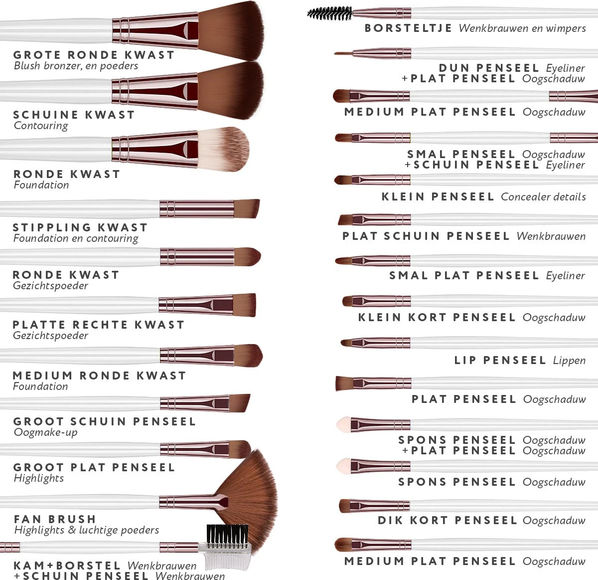 - inhoud verpakking: 24 make-up kwasten + 1 gratis wenkbrauwkammetje + 1 luxe etui