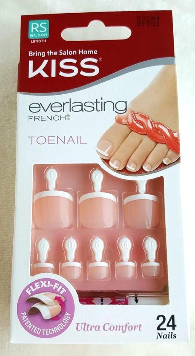 Kiss Everlasting French Nails bevat 24 french tip kunstnagels voor tenen in verschillende maten, een nagellijm, manicure stick en mini nagelvijl. De glue-on toenails zijn eenvoudig te verwijderen en beschadigen de natuurlijke nagels niet.
