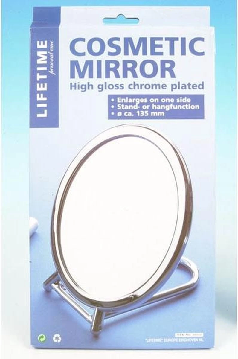 Make-up spiegel van chroom met een diameter van 15 cm.