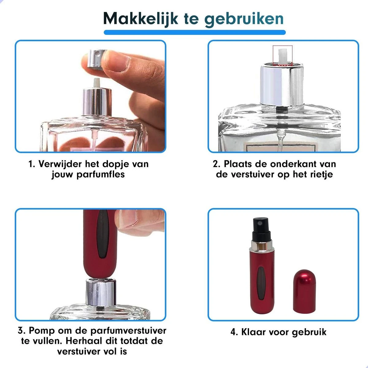 De verstuiver vullen is gemakkelijker dan je denkt. Haal de dop van je parfumflesje af, zet de onderkant van de verstuiver op het witte tuitje en begin met pompen. Via het handige doorzichtige raampje kan je goed zien hoeveel parfum in de verstuiver zit. Het anti-lek en glasvrije materiaal zorgen ervoor dat jouw tas droog blijft.