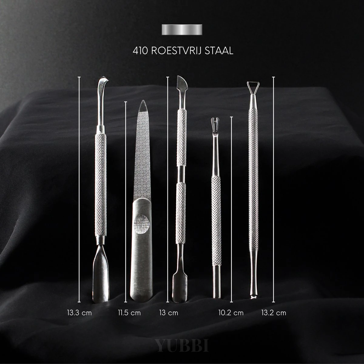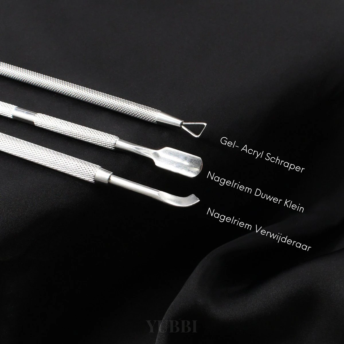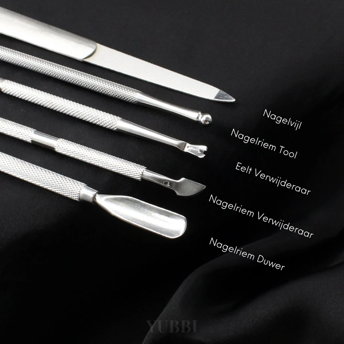 Onze compacte nagelverzorging set bevat alle tools die je nodig hebt voor je manicure of nagelvoorbereiding voor gel/acryl nagels. Onze dubbelzijdige tools geven je alles wat je nodig hebt, en neemt minder ruimte in beslag.